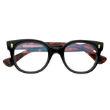 The Cutler and Gross 9298 is a round frame with a distinctive bouncing browline for a touch of eccentricity. Handcrafted with a saddle bridge and finished with signature metal detailing.