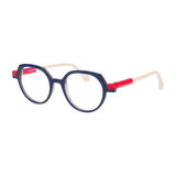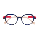 Face à Face Kyoto 1 is a playful, geometric frame with rounded lenses and bold graphic details at the temple hinge. Its layered acetate construction and colour-blocked design make it a standout piece with creative character and charm.
